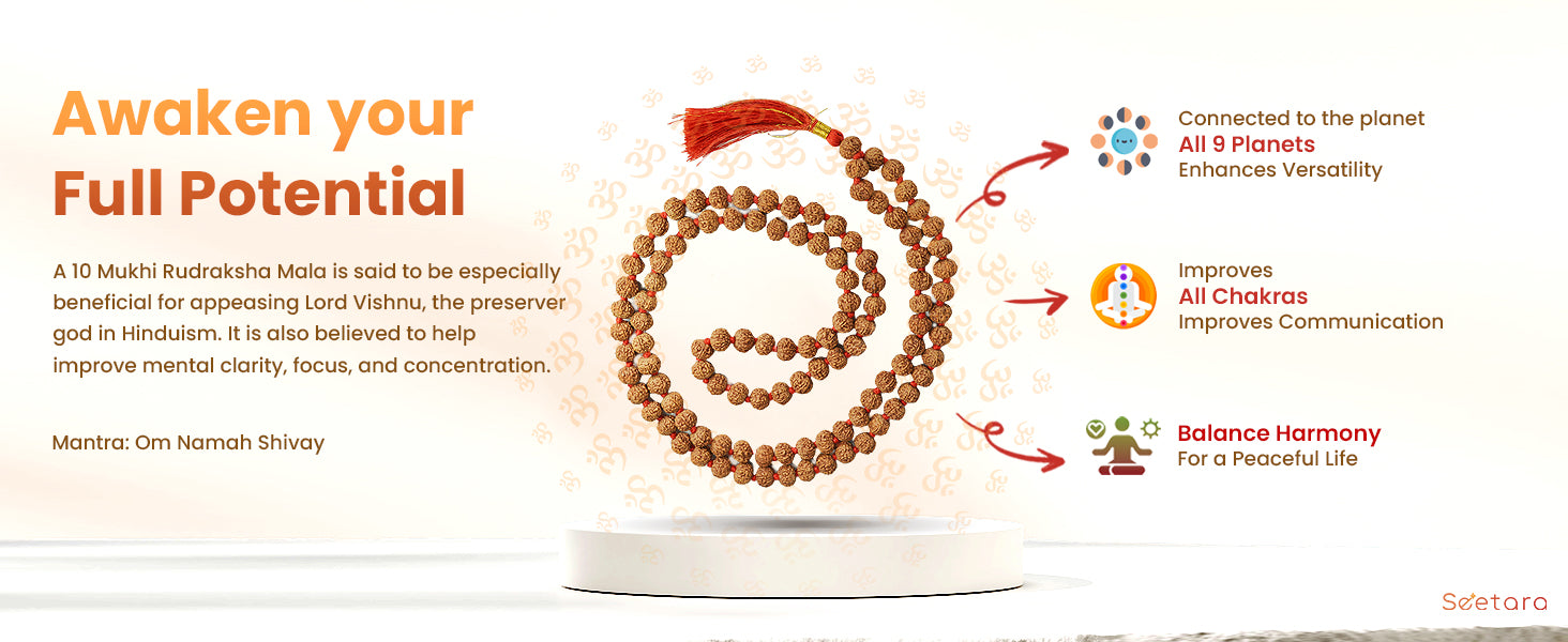 Unleash the power of divine protection with Seetara's 10 Mukhi Rudraksha Mala, a sacred bead revered for its potent spiritual and astrological benefits. Representing Lord Vishnu, the preserver of the universe, this mala is a shield against negativity and misfortune, bringing harmony and prosperity into your life.