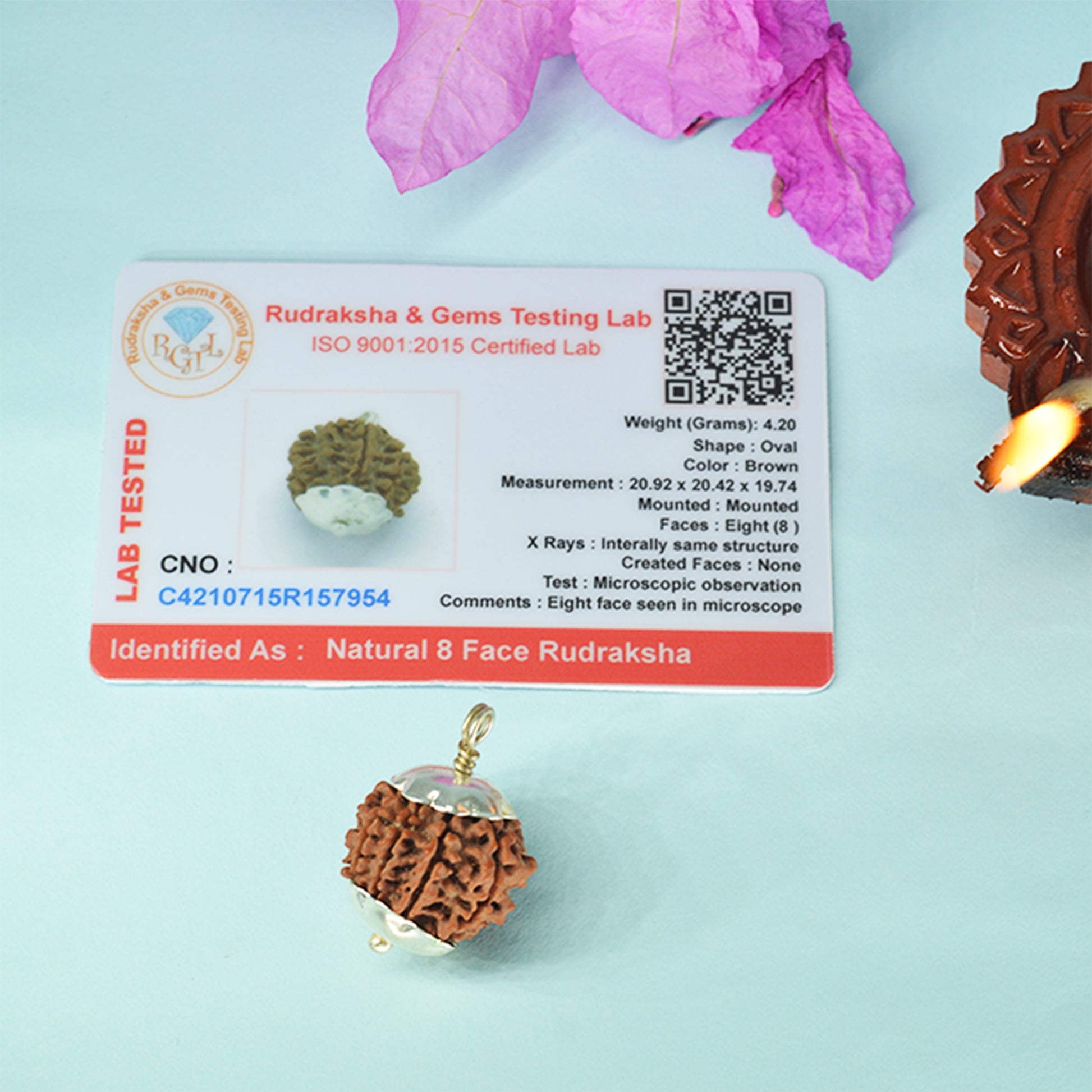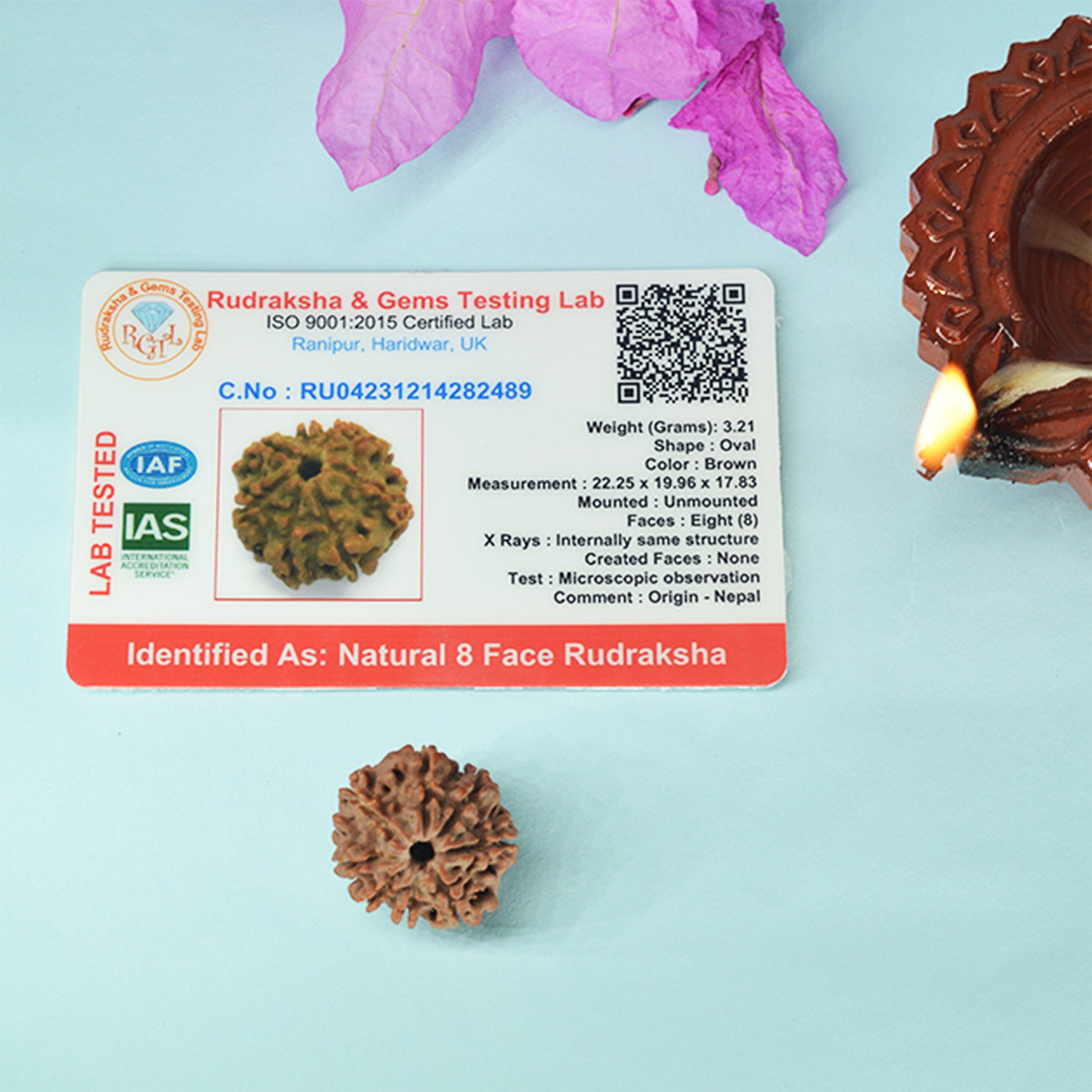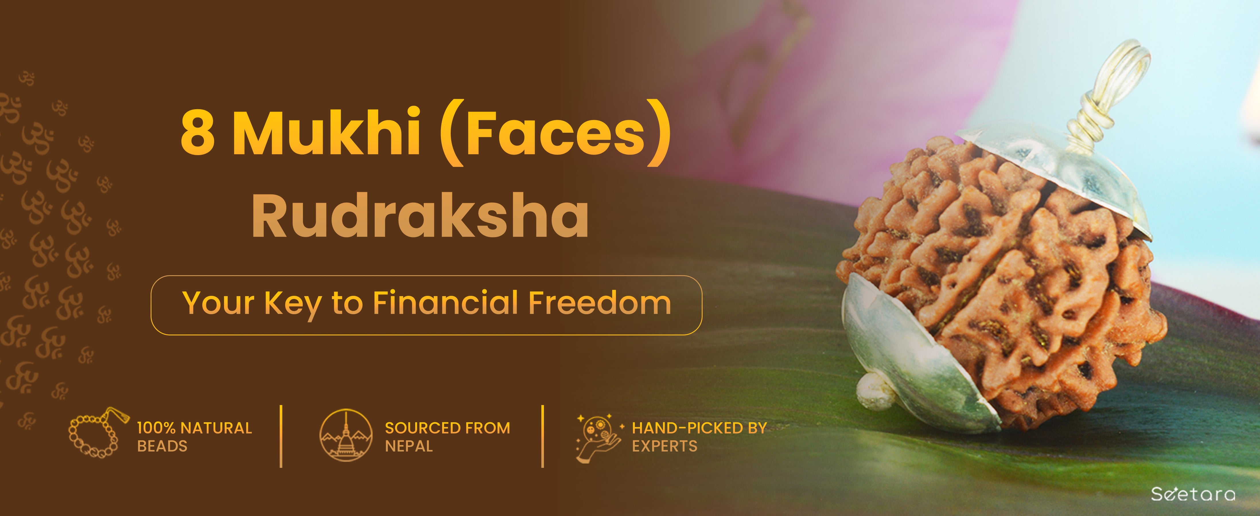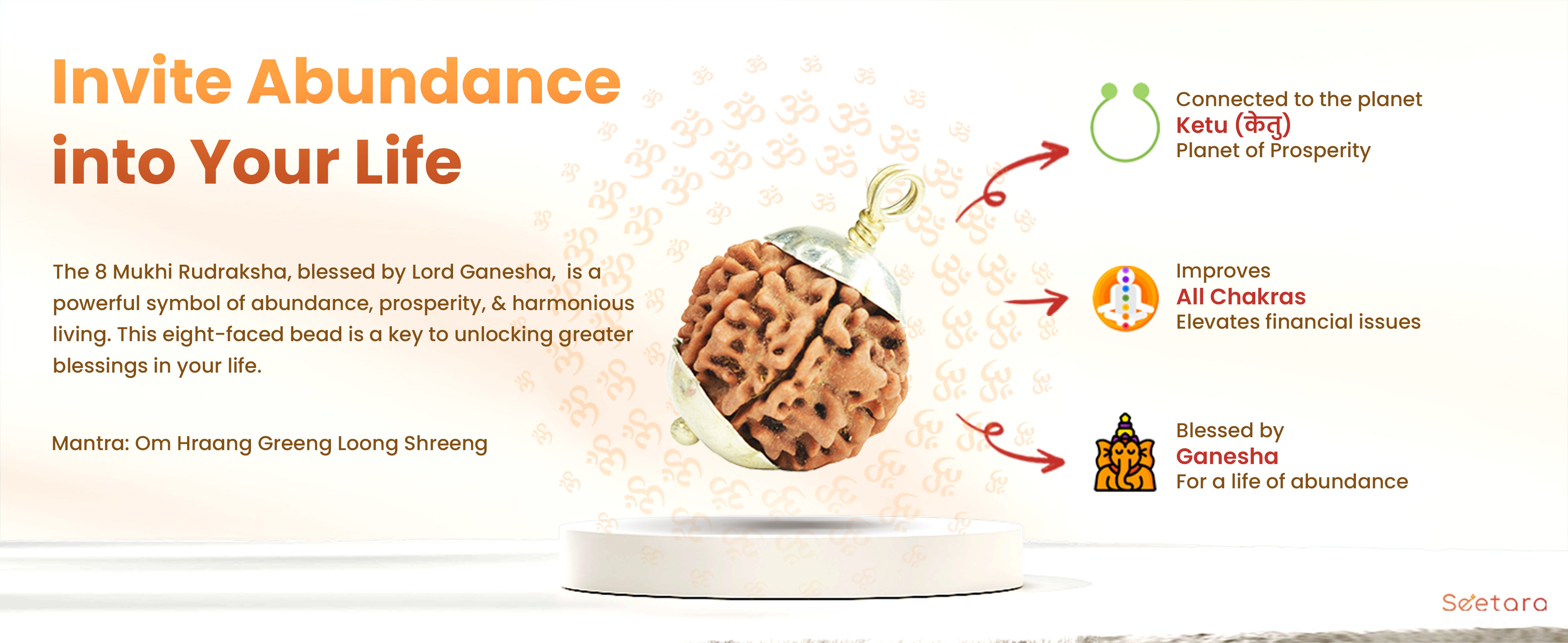 Embrace the transformative power of the original 8 Mukhi Rudraksha, revered as a symbol of Lord Ganesha's wisdom and blessings. This auspicious bead is renowned for its ability to bestow immense mental strength, remove obstacles, and bring fortune into one's life. Ruled by the shadow planet Ketu, it helps suppress malefic effects and attracts wisdom and prosperity.