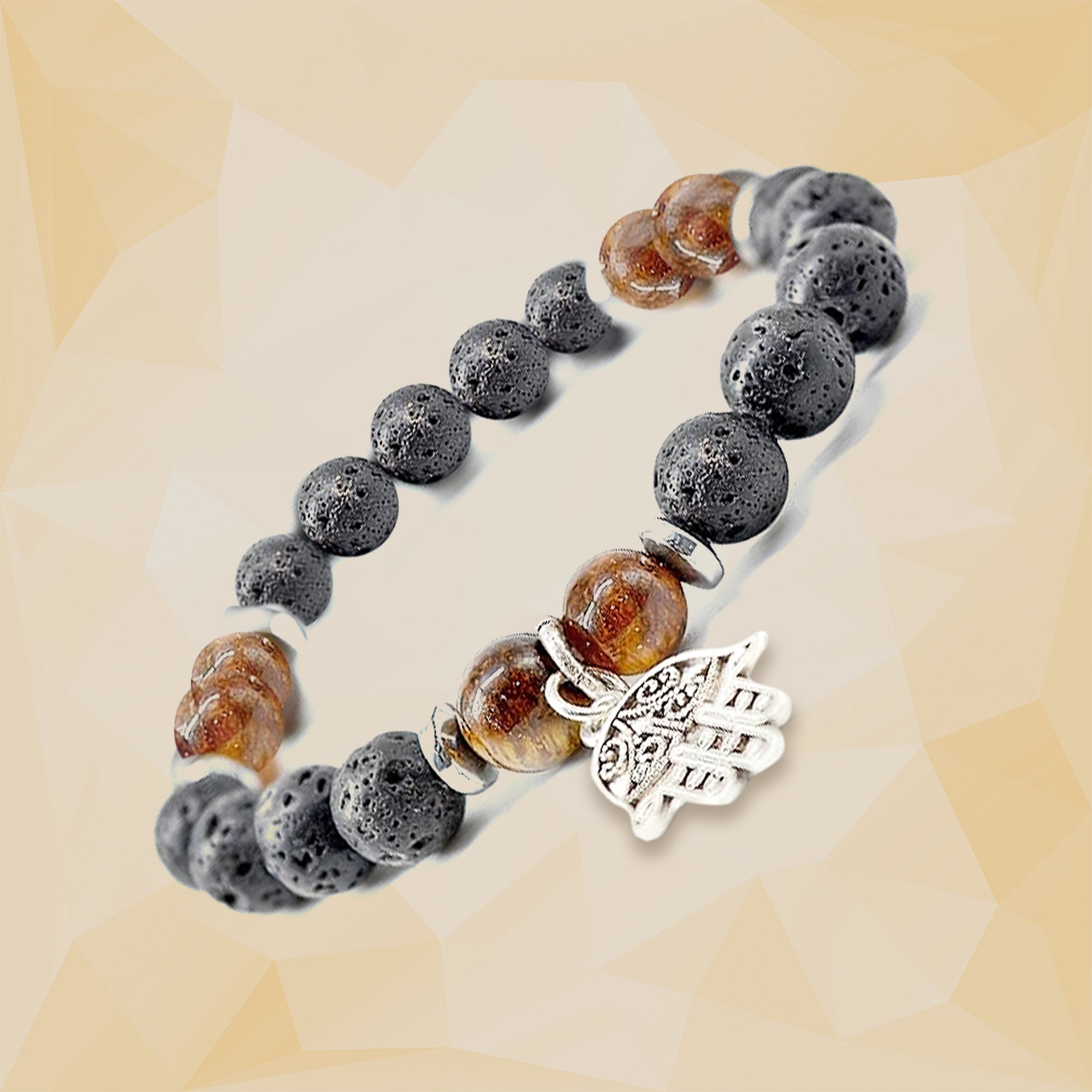 Tiger Eye & Lava Stone Healing Crystal Bracelet with Hamsa Charm | For Courage & Willpower